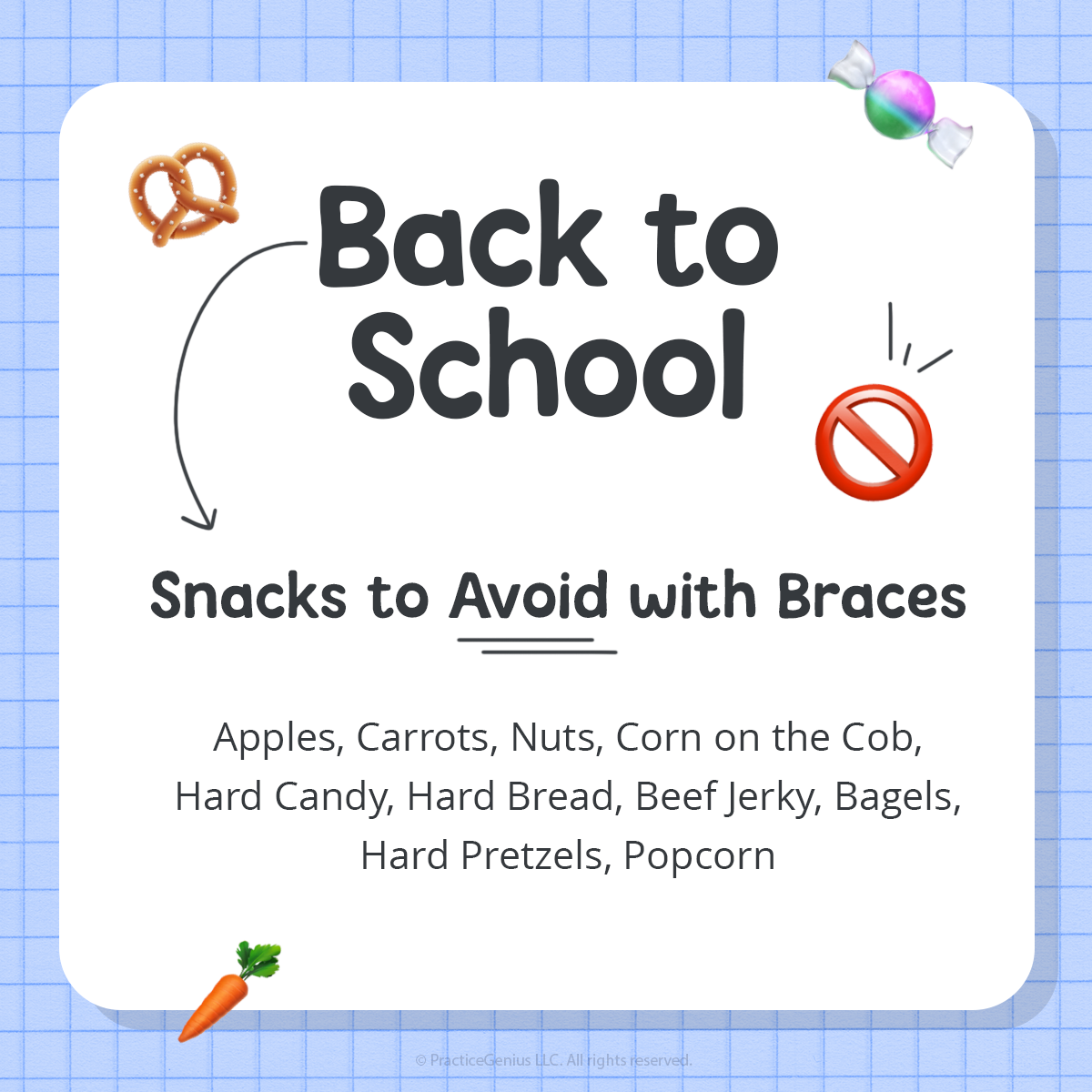 Back to school with braces 😁 Try to stay clear of these snacks to keep your braces safe.